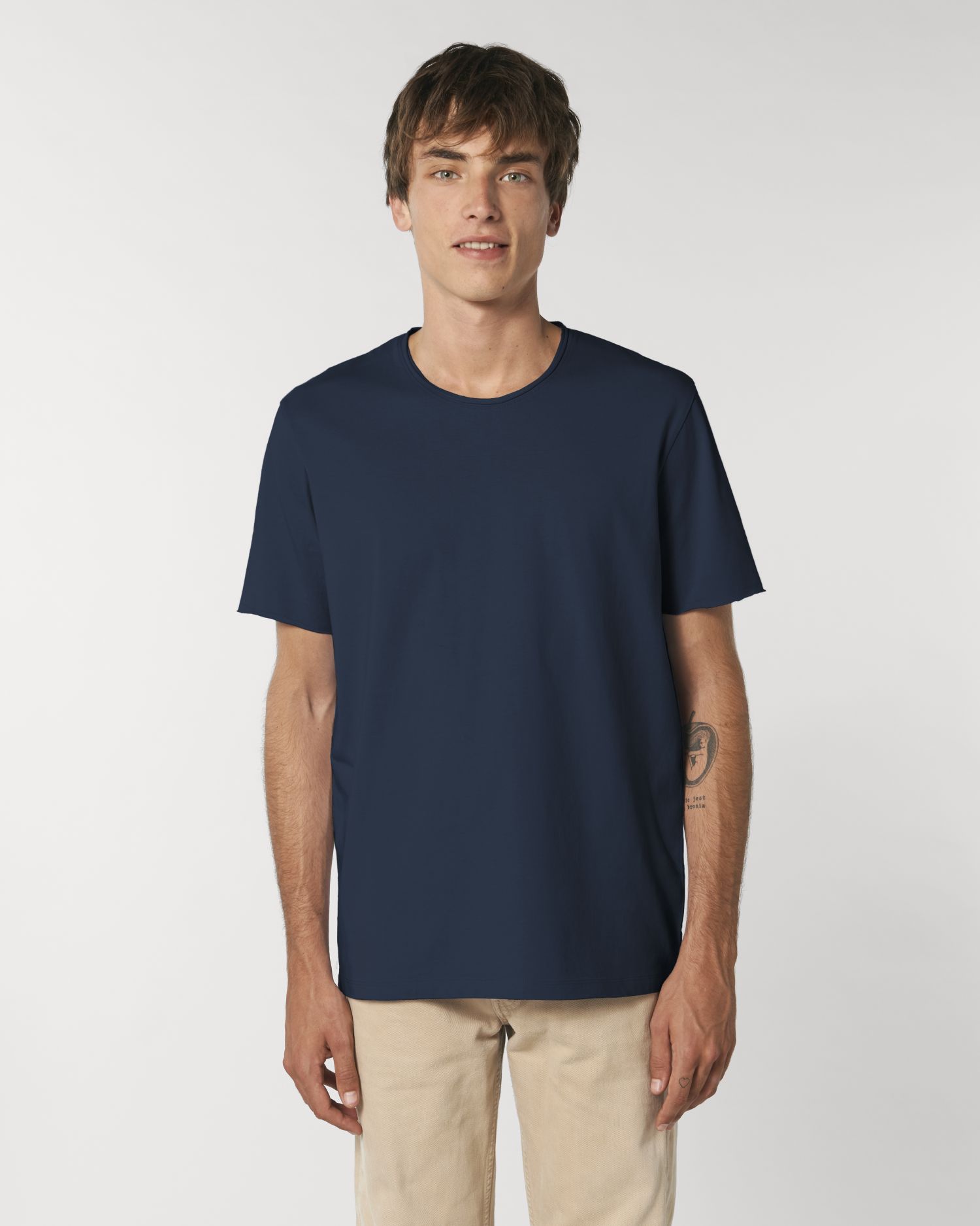 Raaka reuna unisex t-paita. Normaali istuvuus, Pyöreä pääntie, Lyhythihainen, Single jersey-neule. Mukautettu hiha Yksiommel pääntiessä raakareuna Ketjuommel hihoissa raakareuna Kapea kaksoisommel helmassa Vaate pesty